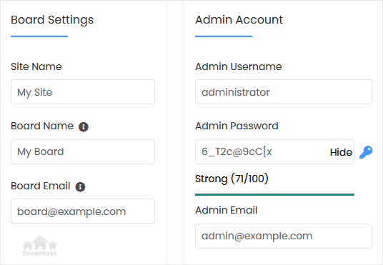 • Admin Username: Your new MyBB username (for security reasons, do not use the administrator or the admin username).