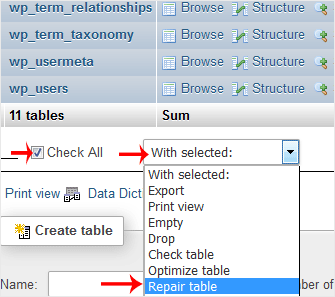 4. Scroll down and mark Check All. Then click on the drop-down arrow and select Repair table.